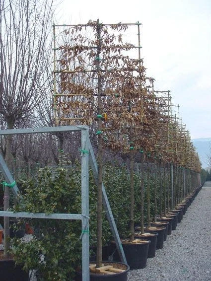 Carpinus betulus, de haagbeuk gekweekt als leiboom.